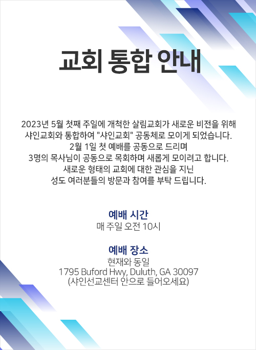 주소 : 1795 Buford Hwy, Duluth, GA 30097 (샤인선교센터 안으로 들어오세요)이메일 : sallimchurch23@gmail.com